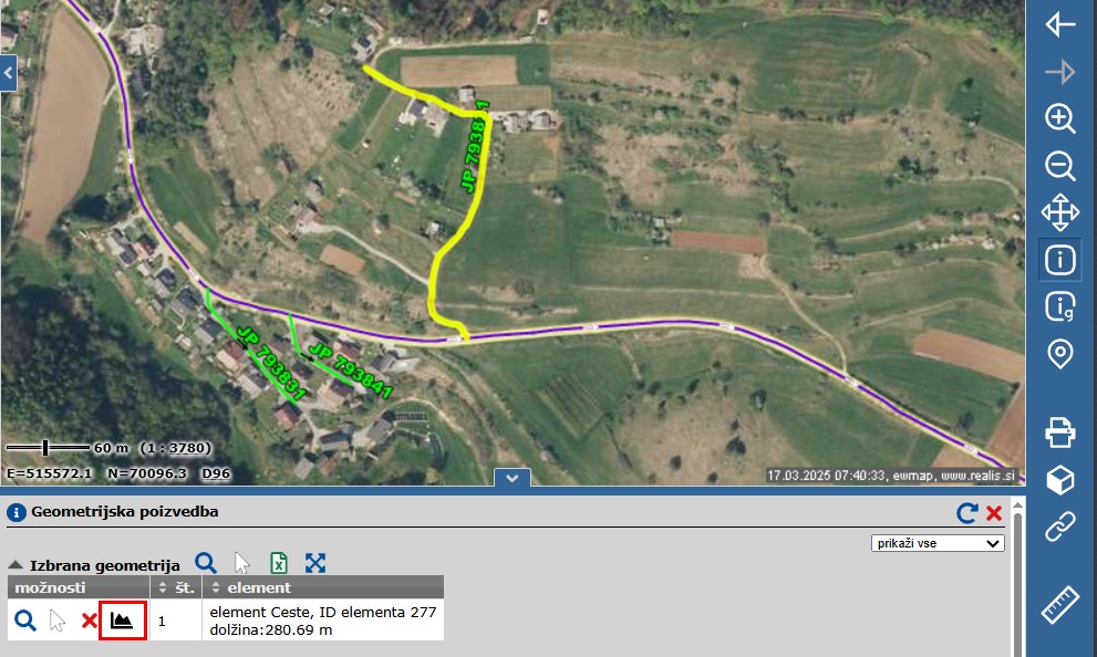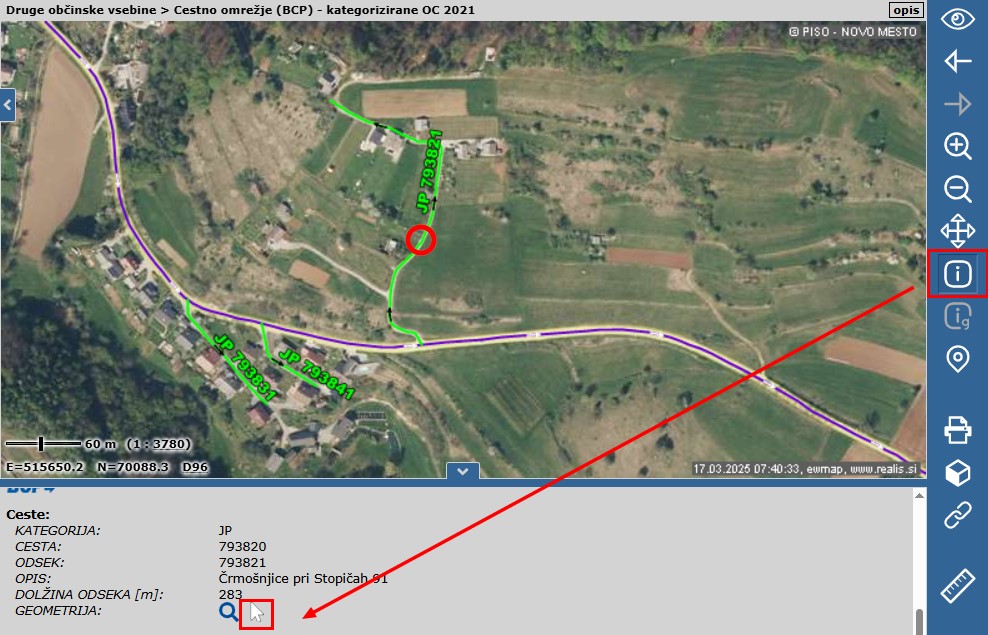 | 1. Z lokacijsko poizvedbo kliknemo na element. Pod karto se izpišejo podatki in kliknemo na ikono za izbor geometrije. |
